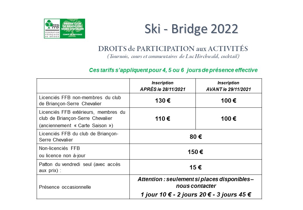 Tournois de régularité, Cours, Festivals de Bridge en janvier et en juin