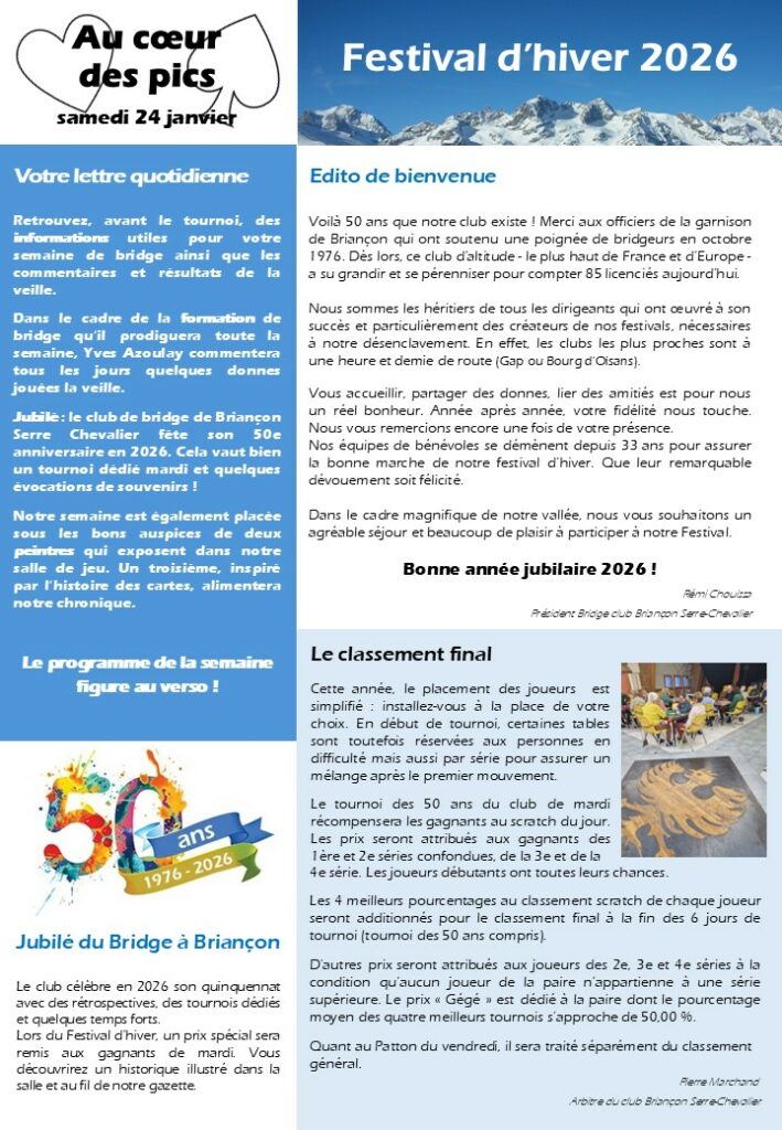 Tournois de régularité, Cours, Festivals de Bridge en janvier et en juin